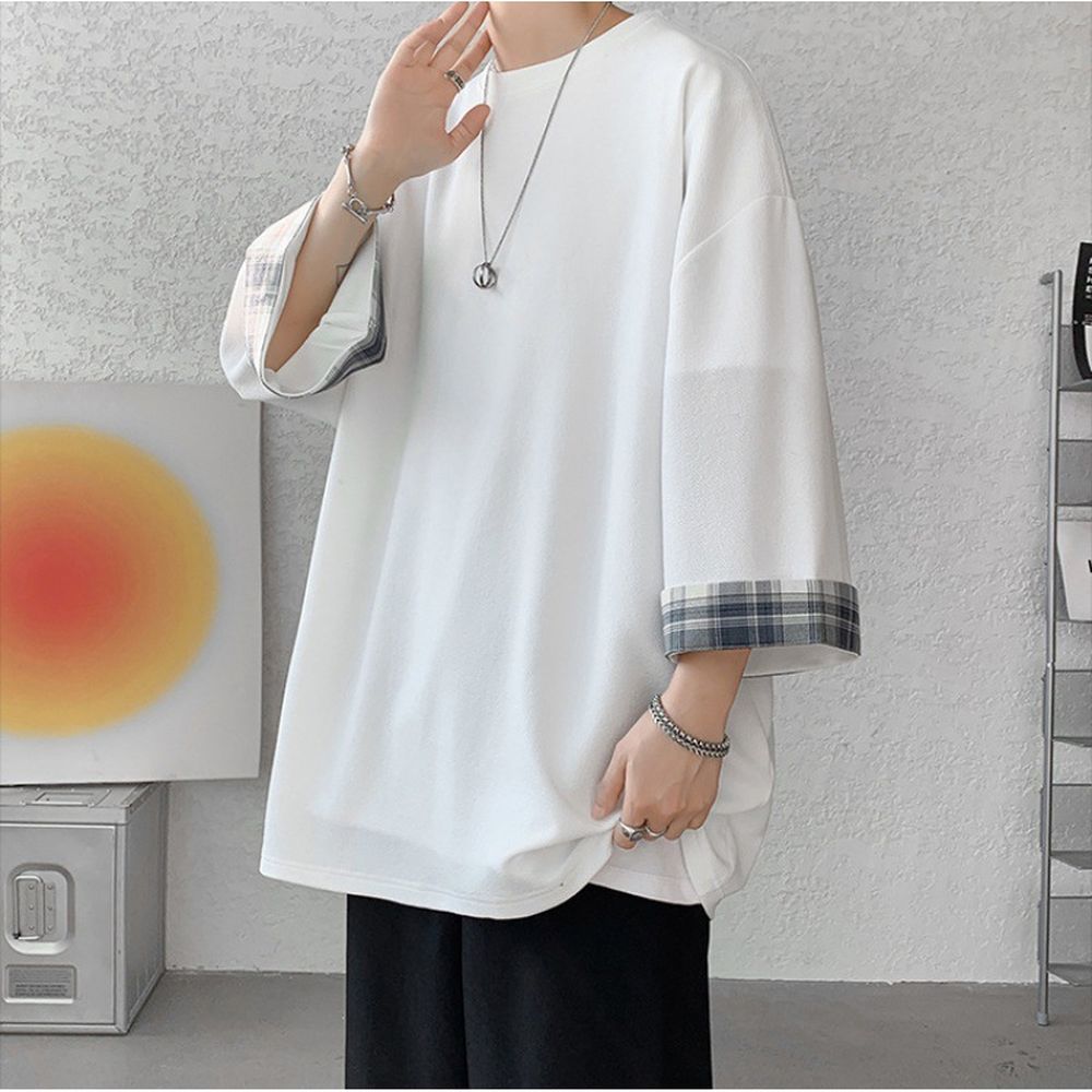 Men's Summer Plaid Patchwork Three-Quarter Sleeve T-Shirt