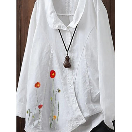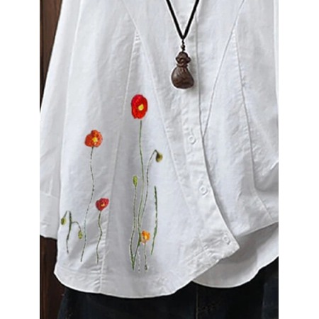 Summer Hot Embroidered Cotton Linen Short Sleeve Loose Casual Button T-Shirt Women